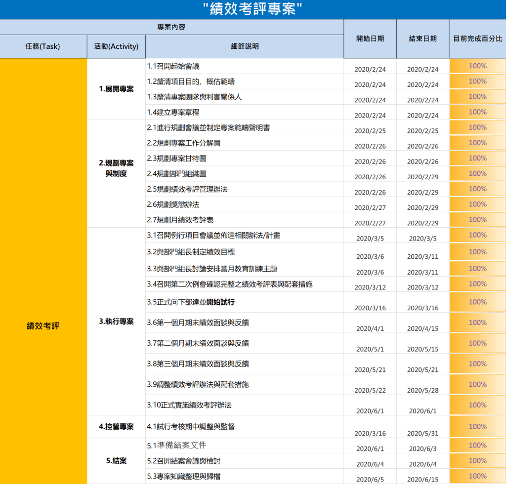 六、正式實施績效考評制度並每季檢討,必要時進行修正。