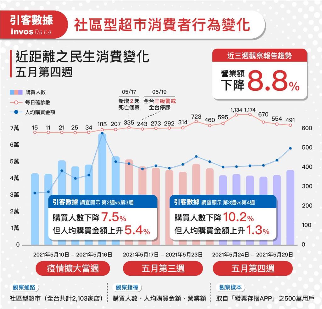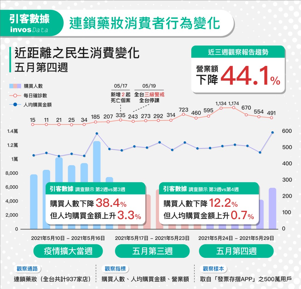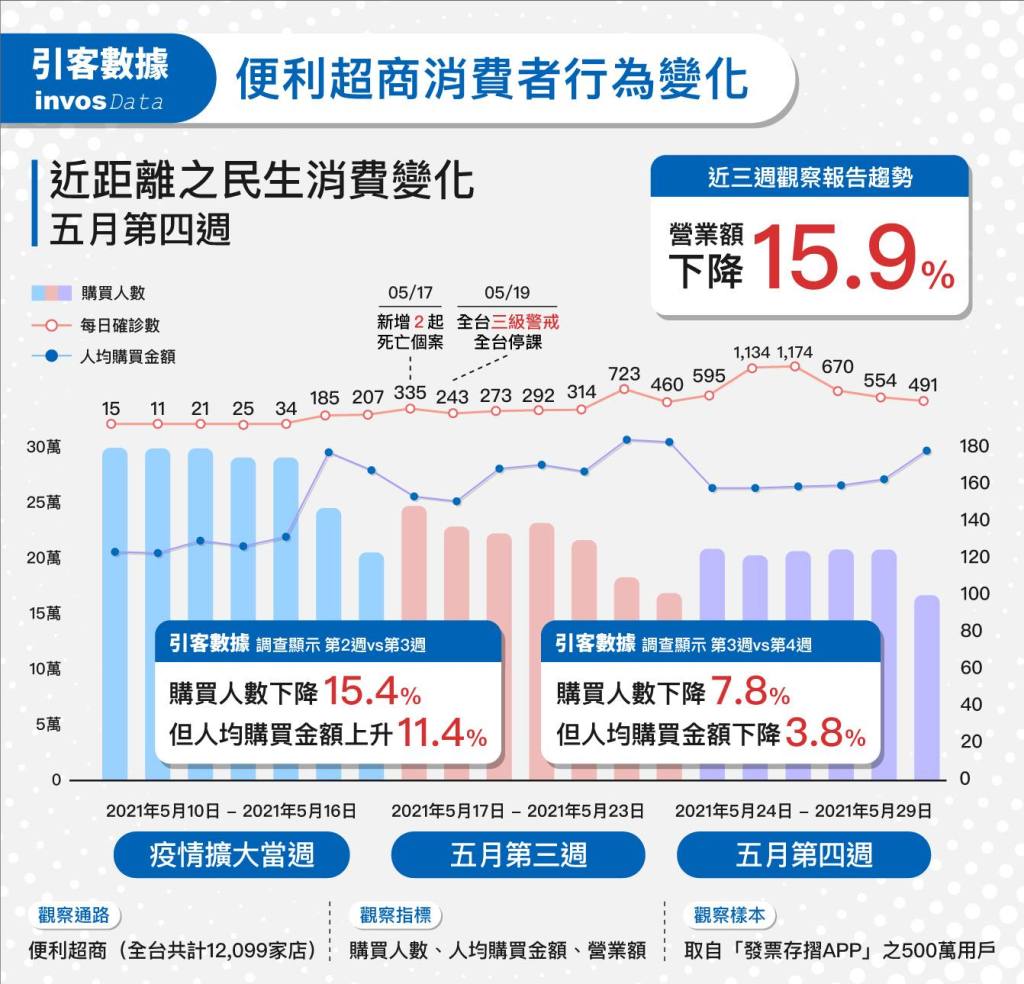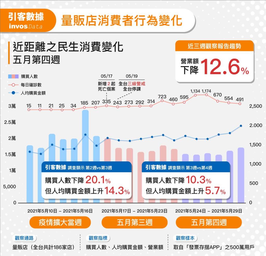 近來新冠疫情升溫,多數實體店面受到強烈衝擊,依引客數據資訊,5月19日全國宣布升至三級警戒後,近兩週內各類型之線下民生消費通路之實際人流數均明顯下滑,其中尤以全台百貨公司雪崩下降74.6%為最,其次藥妝通路亦下降約過半為46.6%;而提供基本民生必須品為主之四大超商、社區型超市、及量販店,實際人流則分別下滑22.6%、15.8%、及27.8%。