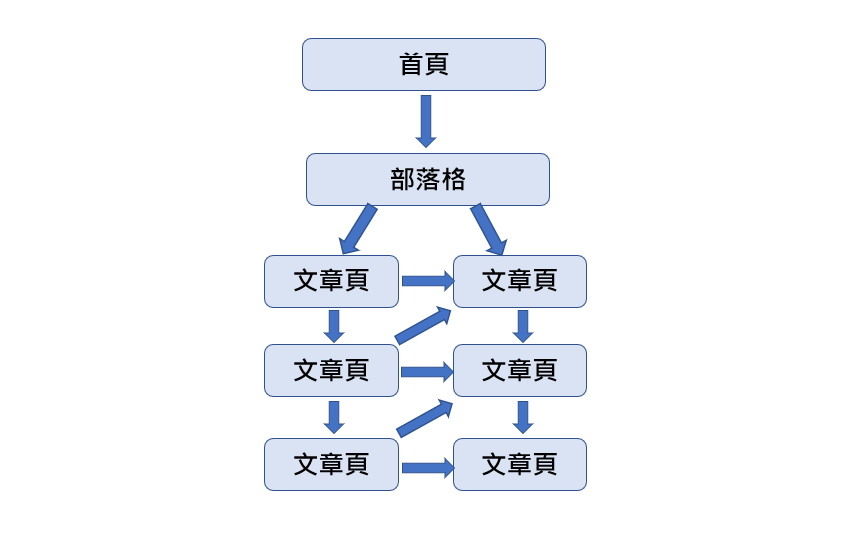 以內部連結而言,彼此的互聯情況應該是從首頁往下與類別頁、部落格有互聯(類別頁有相關聯亦可互聯),部落格下方的文章再與相關連文章連結,彼此呈現交錯的一個連結情況,而非僅由上而下的連結。